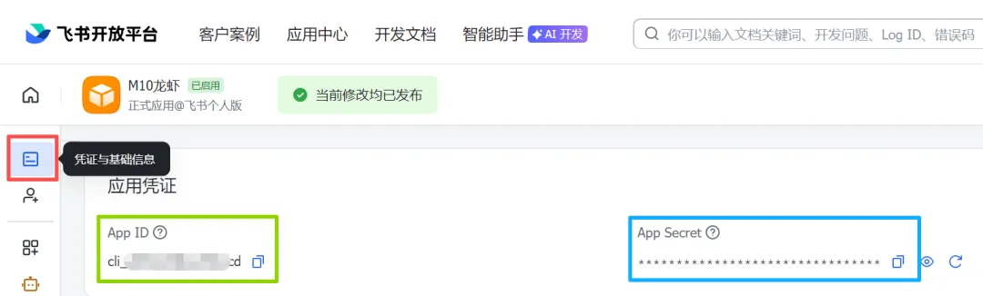 2.进入应用后台,“凭证与基础信息”中复制App ID、App Secret,粘贴到配置文件对应位置(无多余空格);