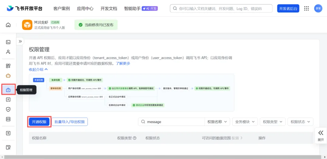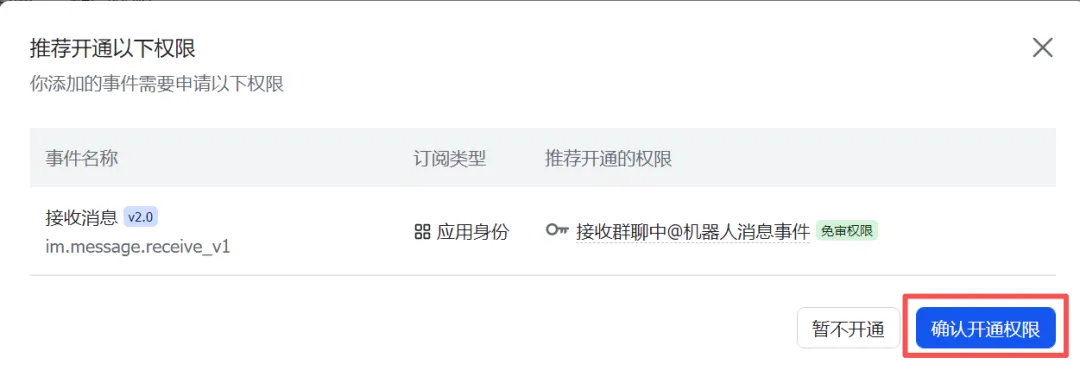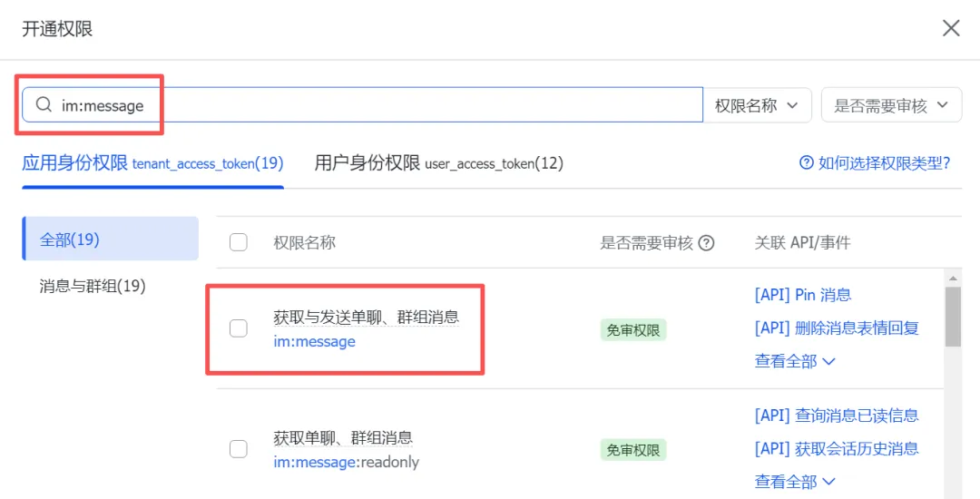 3.“权限管理”开启3个权限:im:message、im:message:send_as_bot、im:resource,勾选后确认;