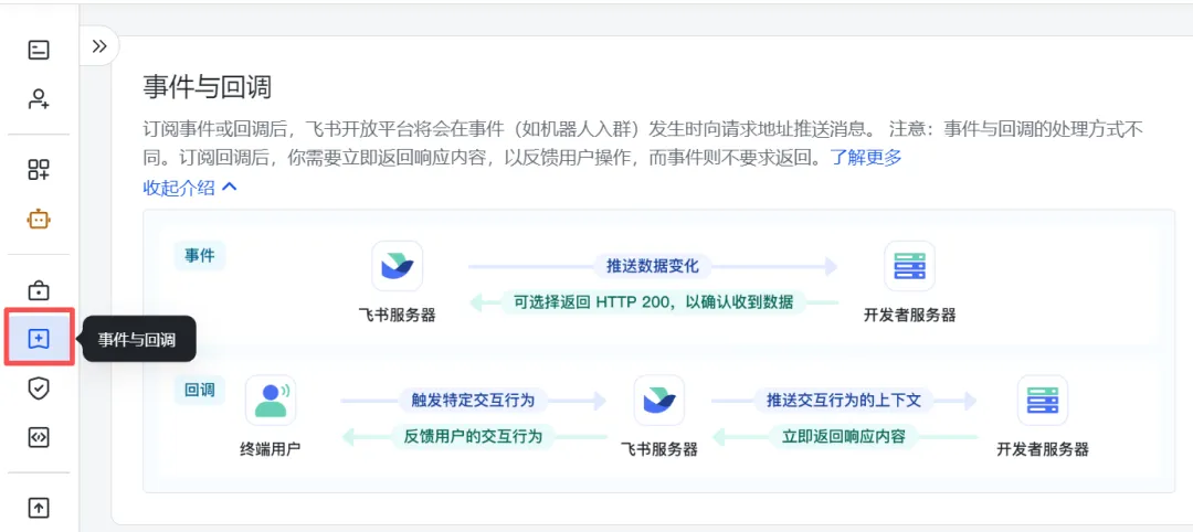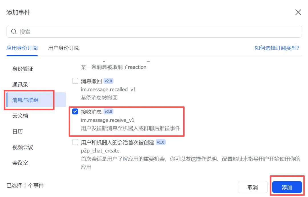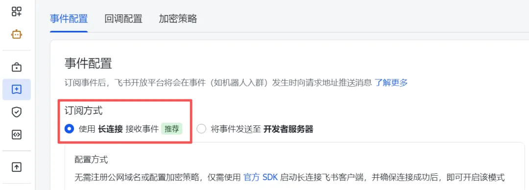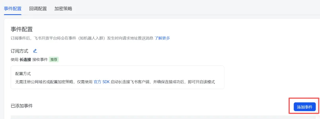 4.“事件与回调”选择长连接,添加事件只勾选“接收消息”,订阅方式选长连接。