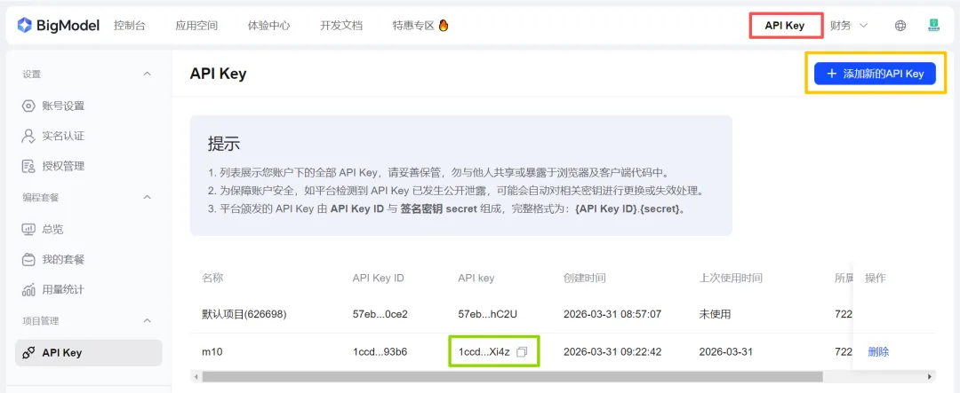 2.控制台→API Key→创建API Key,复制后粘贴到配置文件对应位置(不泄露)。