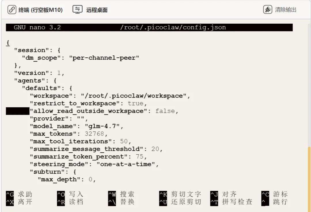 JSON "agents": { "defaults": { "model_name": "glm-4.7", "max_tokens": 32768, // 其他字段保持默认即可 } } |