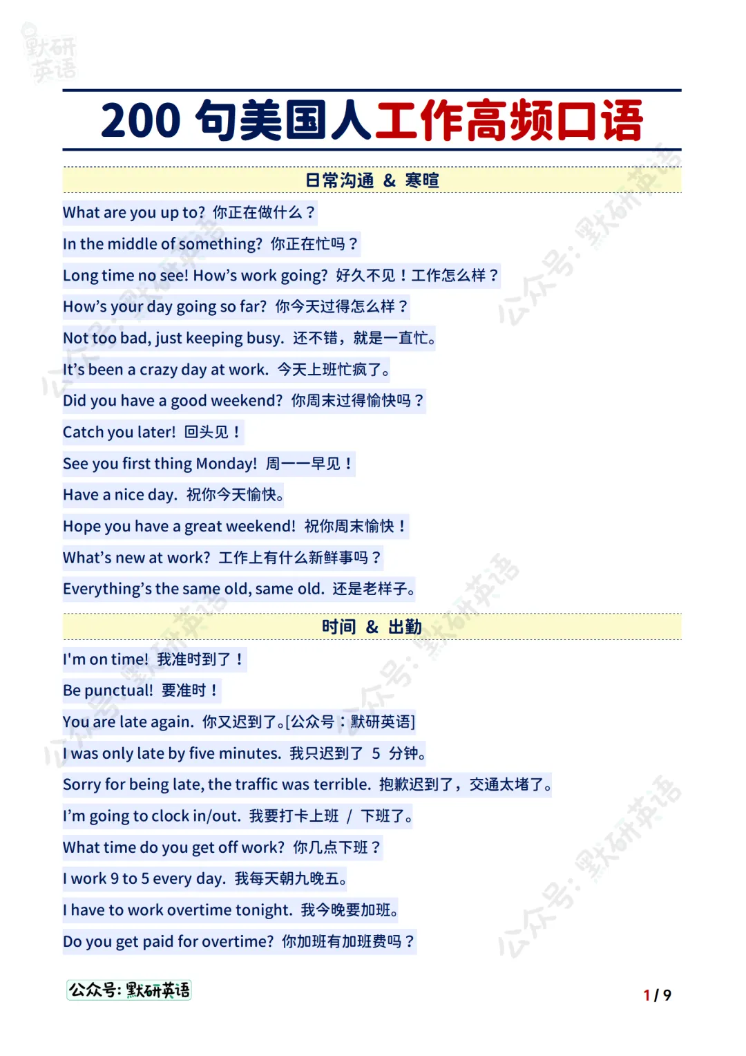 还在为职场英文沟通卡壳发愁?和外国同事交流只会说简单句?这份美国人工作高频口语 200 句直接封神!