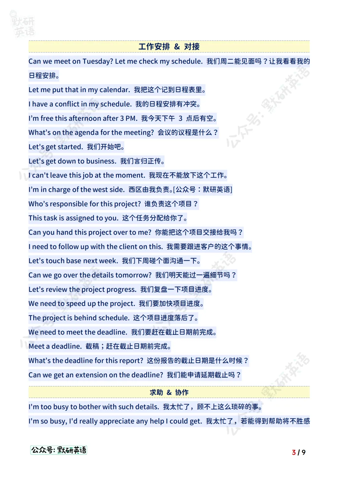 Can we meet on Tuesday? Let me check my schedule. 我们周二能见面吗?让我看看我的日程安排。 Let me put that in my calendar. 我把这个记到日程表里。 I have a conflict in my schedule. 我的日程安排有冲突。 I’m free this afternoon after 3 PM. 我今天下午 3 点后有空。 What’s on the agenda for the meeting? 会议的议程是什么? Let's get started. 我们开始吧。 Let's get down to business. 我们言归正传。 I can't leave this job at the moment. 我现在不能放下这个工作。 I’m in charge of the west side. 西区由我负责。 Who’s responsible for this project? 谁负责这个项目? This task is assigned to you. 这个任务分配给你了。 Can you hand this project over to me? 你能把这个项目交接给我吗? I need to follow up with the client on this. 我需要跟进客户的这个事情。 Let’s touch base next week. 我们下周碰个面沟通一下。 Can we go over the details tomorrow? 我们明天能过一遍细节吗? Let’s review the project progress. 我们复盘一下项目进度。 We need to speed up the project. 我们要加快项目进度。 The project is behind schedule. 这个项目进度落后了。 We need to meet the deadline. 我们要赶在截止日期前完成。 Meet a deadline. 截稿;赶在截止日期前完成。 What’s the deadline for this report? 这份报告的截止日期是什么时候? Can we get an extension on the deadline? 我们能申请延期截止吗?