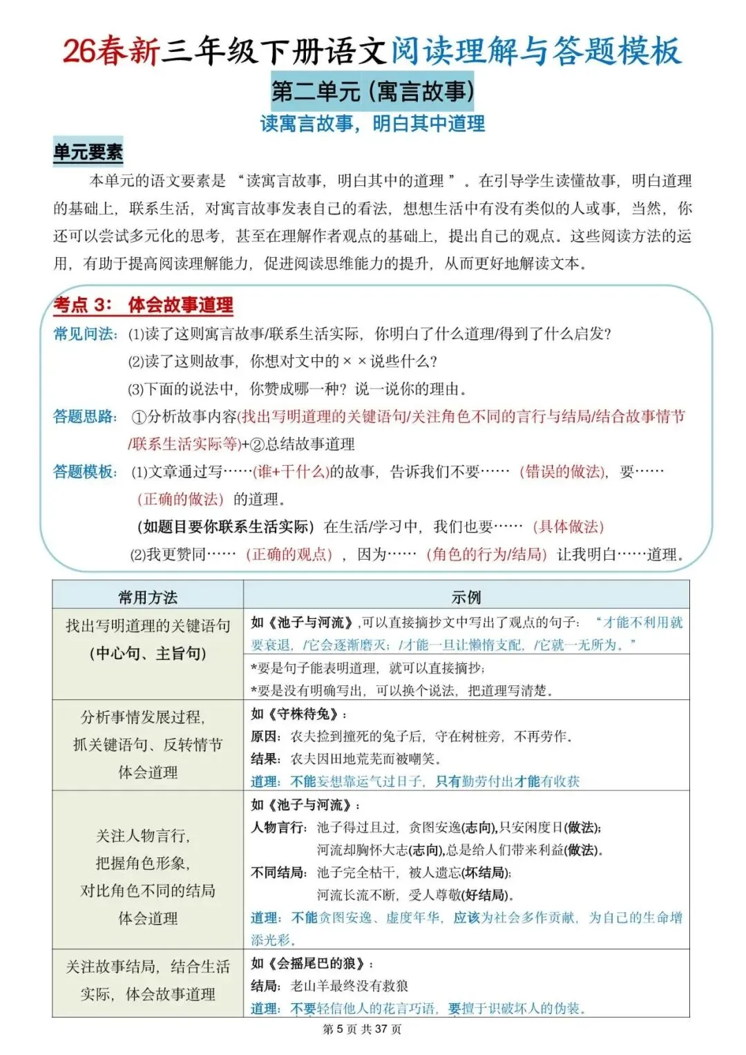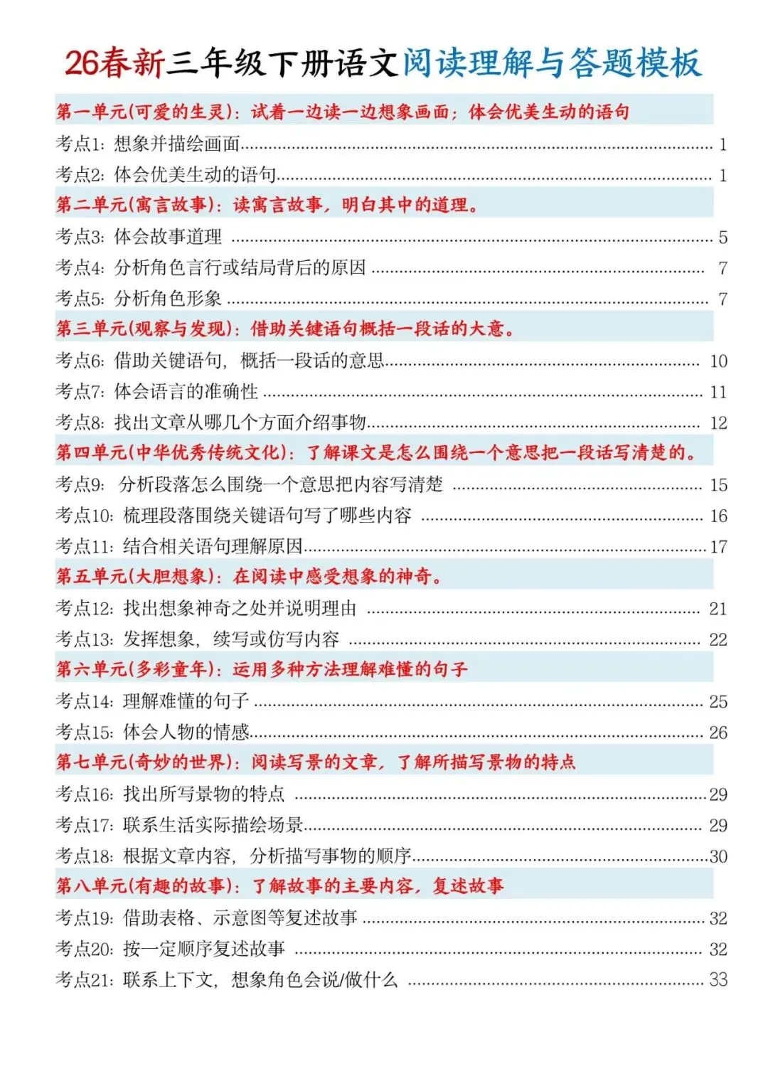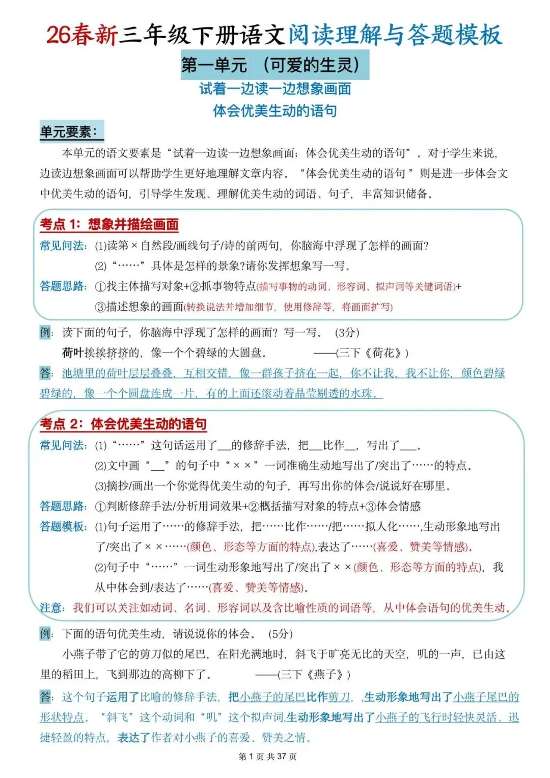 26春新三年级下册语文阅读理解与答题模板(37页)