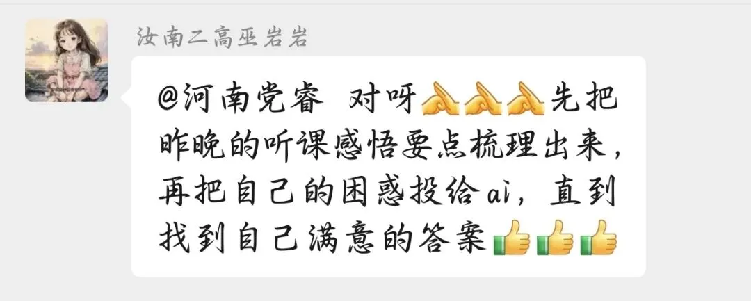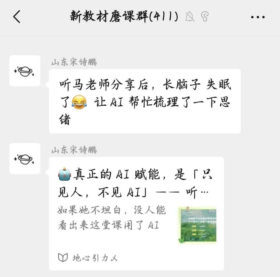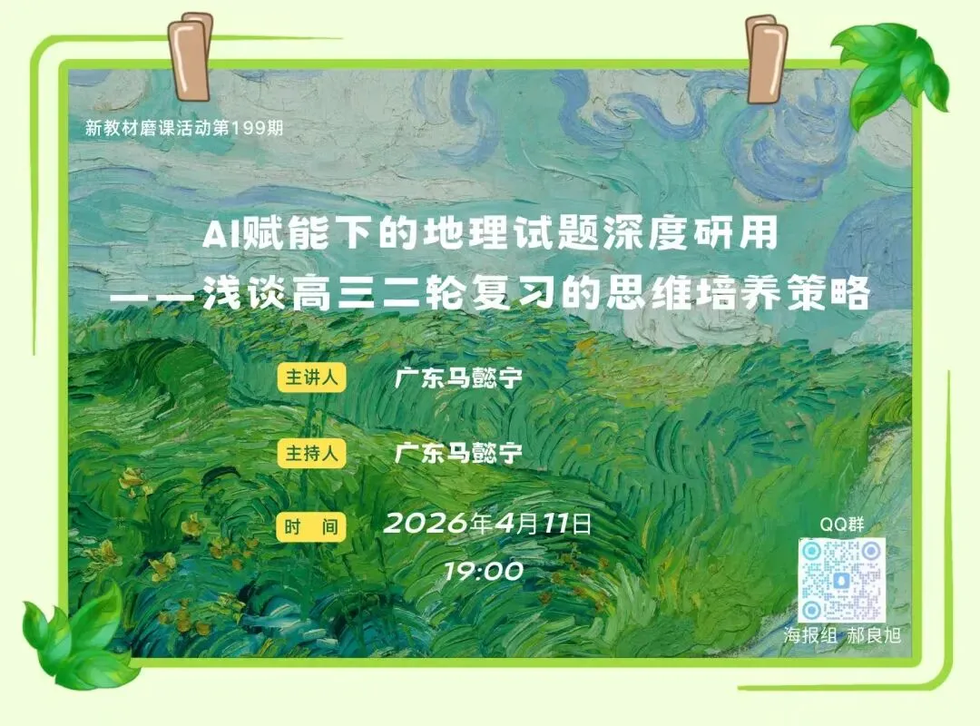这是昨晚我在"新教材磨课群"第 199 期活动里,听广东马懿宁老师分享《AI 赋能下的地理试题深度研用》时,脑子里反复出现的一句话。