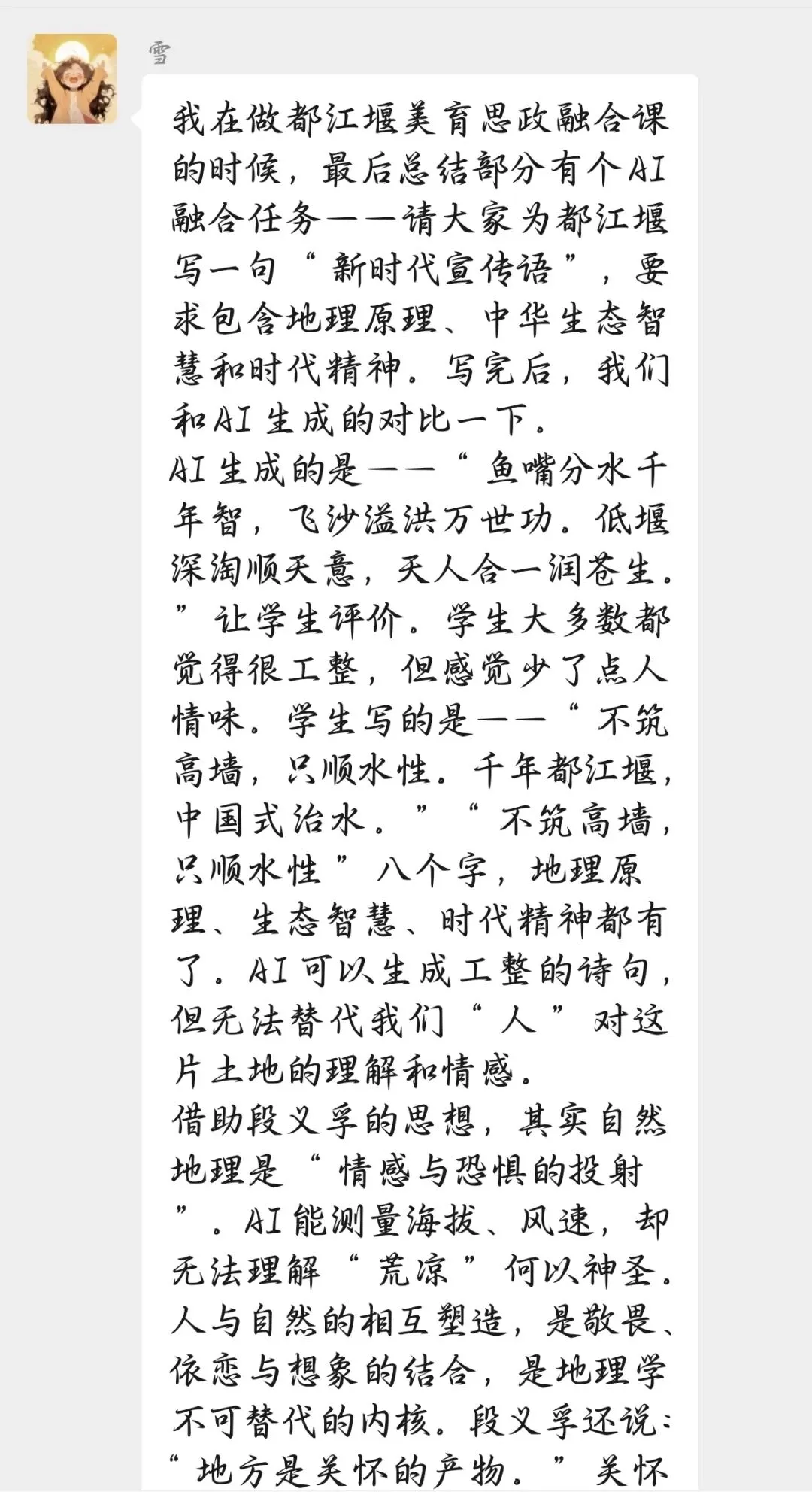 这大概就是 AI 时代教育者该有的样子:向内求,明己心,让技术成为人格的延伸,而非喧宾夺主的表演道具。