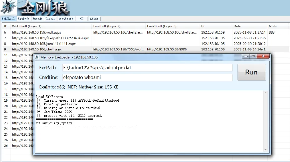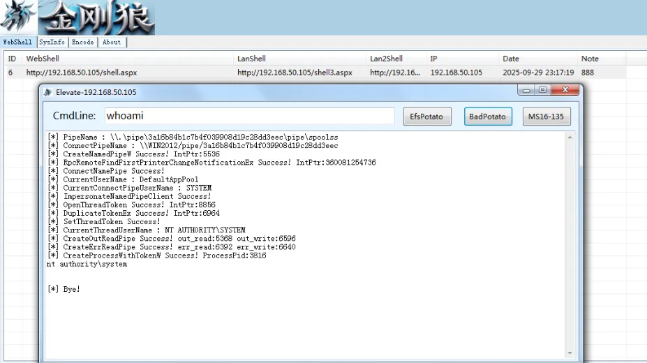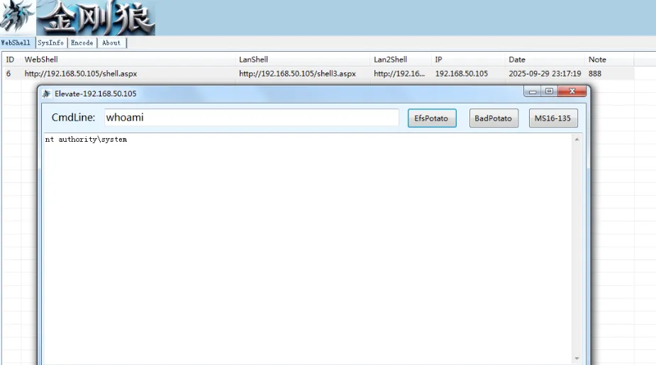 权限提升(Potato系列):支持EfsPotato、BadPotato,利用系统服务漏洞提权。