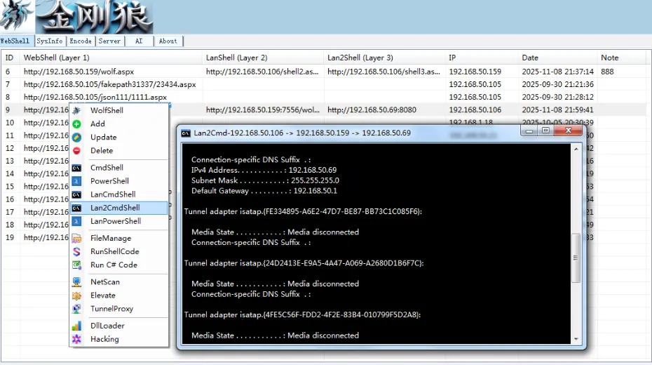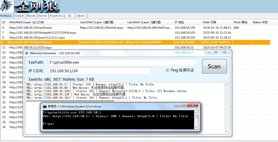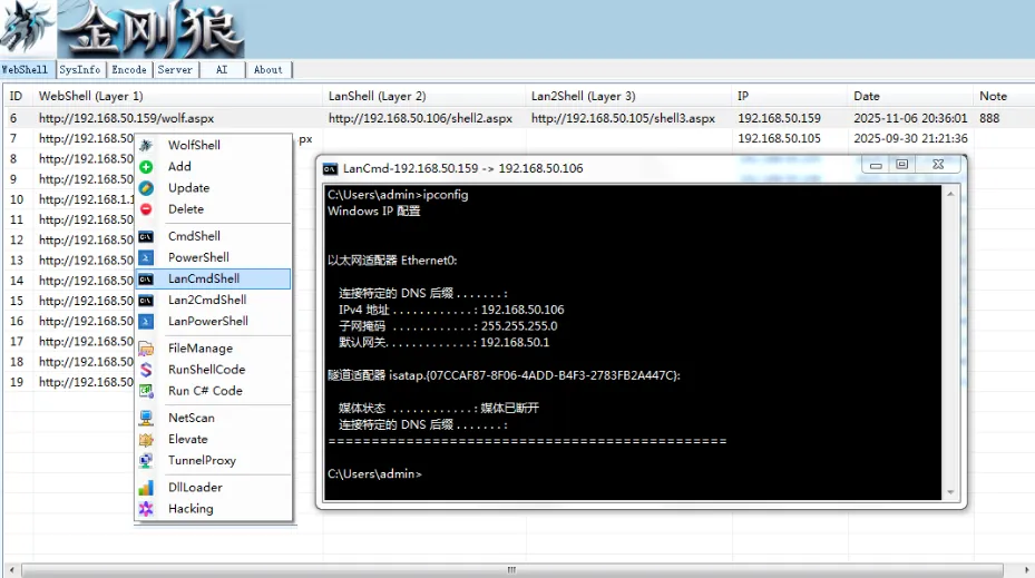 内网级联命令执行:支持级联至内网第二层WebShell执行CMD命令,实现横向移动。