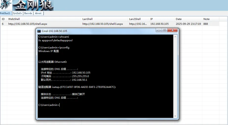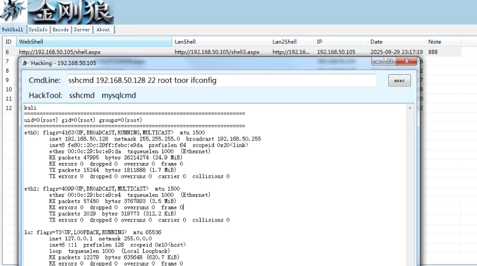 通过入口点 192.168.50.106 级联内网 192.168.50.159 再次级联下一层内网 192.168.50.69 WebShell 执行命令