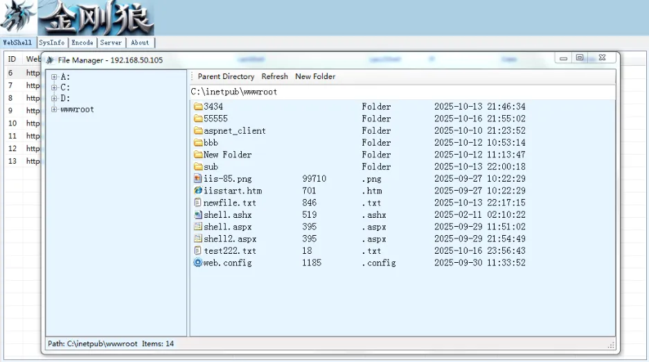 将WolfShell文件上传到目标服务器,支持ASPX、ASHX、内存马3种类型。