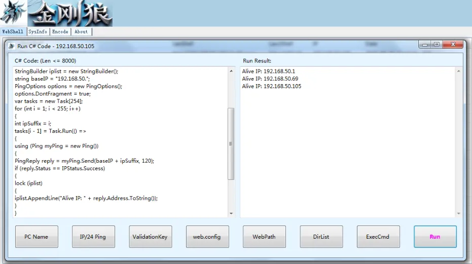 using System;using System.Net;using System.Net.NetworkInformation;using System.Text;using System.Threading.Tasks;public class Eval{publicstringeval(Object obj){StringBuilder iplist = new StringBuilder();string baseIP = "192.168.1.";PingOptions options = new PingOptions();options.DontFragment = true;var tasks = new Task[254];for (int i = 1; i < 255; i++){int ipSuffix = i;tasks[i - 1] = Task.Run(() =>{using (Ping myPing = new Ping()){PingReply reply = myPing.Send(baseIP + ipSuffix, 120);if (reply.Status == IPStatus.Success){lock (iplist){iplist.AppendLine("Alive IP: " + reply.Address.ToString());}}}});}Task.WaitAll(tasks);return iplist.ToString();}}