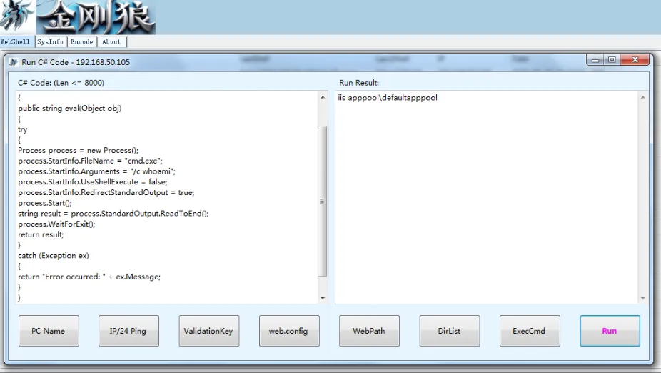 PS C:\Users\admin>whoamiwhoami: IIS APPPOOL\DefaultAppPoolUsername: WIN-021V7TK43N5$PS C:\Users\admin>infoOperating System Version: Microsoft Windows Server 2019 Datacenter 64 bitVersion Number: 10.0.17763PowerShell Version:5.1.17763.1.NET Detailed Versions:PSChildName Version Release----------- ------- -------Client 4.7.03190 461814PS C:\Users\admin>base64:ZWNobyBXb2xmU2hlbGw=WolfShellPS C:\Users\admin>Write-Host "Current User:`n$env:USERNAME"Current User:WIN-021V7TK43N5$
