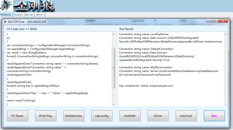 web.config读取:提取数据库连接信息(数据库名、用户、密码)、SMTP/邮件服务器用户密码等。