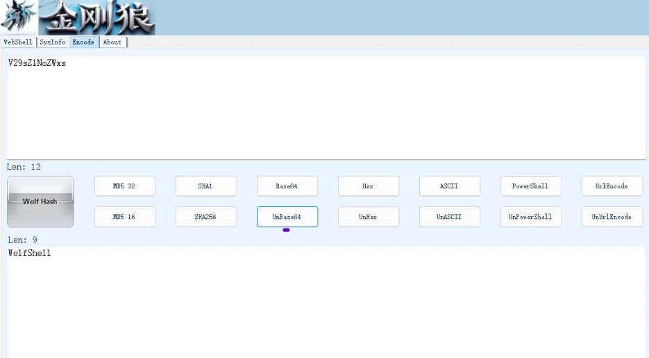 Base64加密代码执行 示例 base64:ZWNobyBXb2xmU2hlbGw=