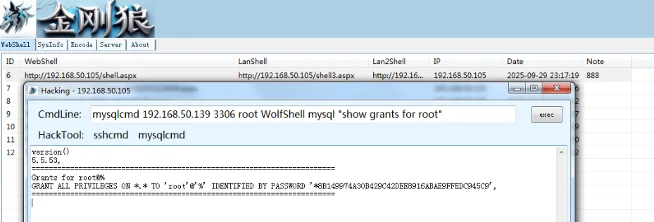 mysqlcmd host port user pass dbname sqlstrmysqlcmd host port user pass dbname sqlb64Demo:mysqlcmd 192.168.50.139 3306 root WolfShell mysql infomysqlcmd 192.168.50.139 3306 root WolfShell mysql ""SELECT VERSION(); ""mysqlcmd 192.168.50.139 3306 root WolfShell mysql ""SELECT 3+5 ""mysqlcmd 192.168.50.139 3306 root WolfShell mysql c2VsZWN0IDMrNQ==";