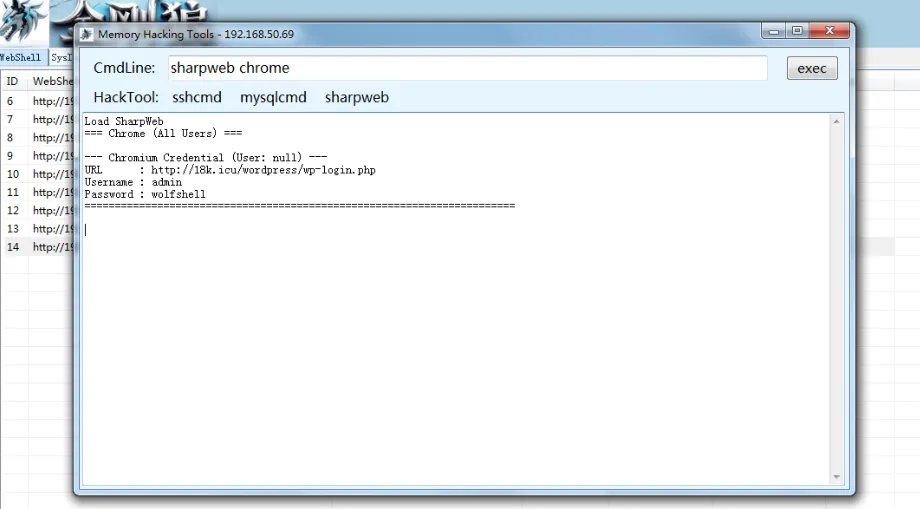 Usage:SharWeb arg0 [arg1 arg2 ...]Arguments:all - Retrieve all Chrome, FireFox and IE/Edge credentials.full - The same as 'all'chrome - Fetch saved Chrome logins. e.g. -d Directoryfirefox - Fetch saved FireFox logins. e.g. -p masterkey -d Directoryedge - Fetch saved Internet Explorer/Microsoft Edge logins.Demo:SharWeb allSharWeb chromeSharWeb chrome -d C:\OutputSharWeb firefox -p mymasterkey -d C:\OutputSharWeb edge=======================================================================