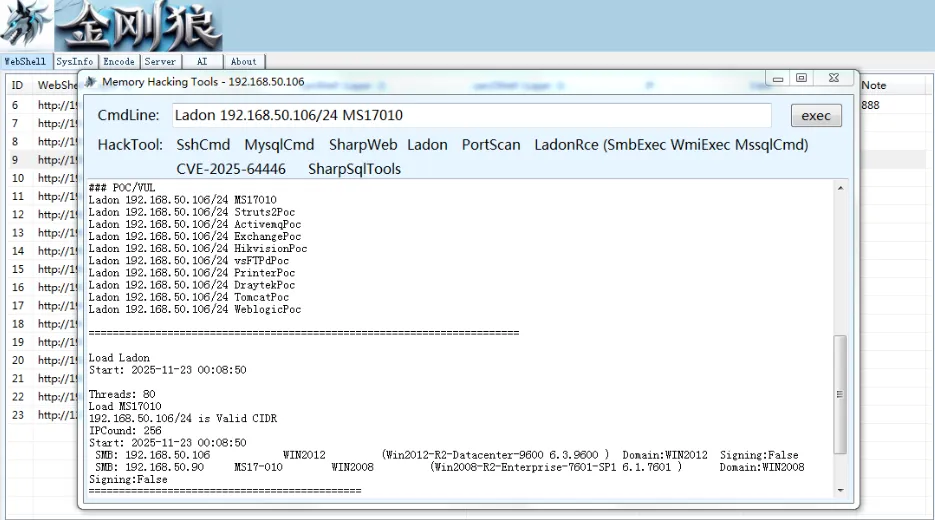 Usage:Ladon whoamiLadon 192.168.50.159/24 ICMP ICMP存活主机探测Ladon 192.168.50.159/24 PortScan 开放端口服务扫描Ladon 192.168.50.159/24 WebScan 网站标题、中间件Ladon 192.168.50.159/24 SmbInfo SMB存活主机探测、NTLM系统信息Ladon 192.168.50.159/24 NbtInfo NBT存活主机探测、NTLM系统信息Ladon 192.168.50.159/24 WmiInfo WMI存活主机探测、NTLM系统信息Ladon 192.168.50.159/24 LdapInfo LDAP存活主机探测、NTLM系统信息Ladon 192.168.50.159/24 RdpInfo RDP存活主机探测、NTLM系统信息Ladon 192.168.50.159/24 SmtpInfo SMTP存活主机探测、NTLM系统信息Ladon 192.168.50.159/24 HttpInfo HTTP存活主机探测、NTLM系统信息Ladon 192.168.50.159/24 WinrmInfo Winrm存活主机探测、NTLM系统信息Ladon 192.168.50.159/24 MssqlInfo SQL数据库主机探测、NTLM系统信息Ladon 192.168.50.159/24 FtpInfo FTP存活主机探测Ladon 192.168.50.159/24 T3Info Weblogic协议探测Ladon 192.168.50.159/24 CiscoInfo Cisco路由器探测Ladon 192.168.50.159/24 SnmpInfo SNMP设备探测,如路由器、交换机等Ladon 192.168.50.159/24 OxidInfo Windows多网卡主机探测Ladon 192.168.50.159/24 EthInfo Windows多网卡主机探测Ladon http://0x7556.org WPinfo WordPress版本、插件探测、漏洞Ladon 192.168.50.159/24 DnsInfo DNS存活主机探测、域名识别