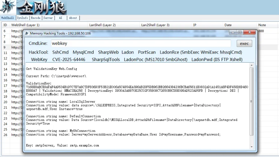 web.config读取:提取数据库连接信息(数据库名、用户、密码)及SMTP/邮件服务器账号密码等。