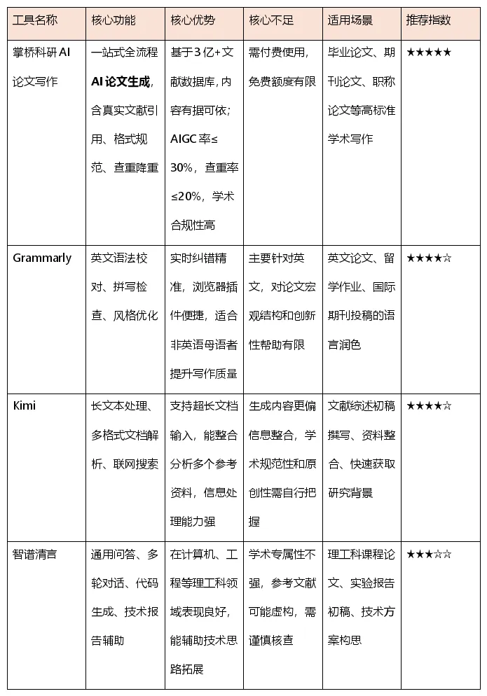 选择AI论文写作工具,关键在于匹配你的核心需求。如果你追求极致的学术严谨性和一站式省心体验,掌桥科研AI论文写作在文献支撑和格式规范上的优势明显。若你主要需要优化英文表达,Grammarly是不二之选。而Kimi和智谱清言则在特定环节(信息整合、思路启发)能提供有力辅助。
