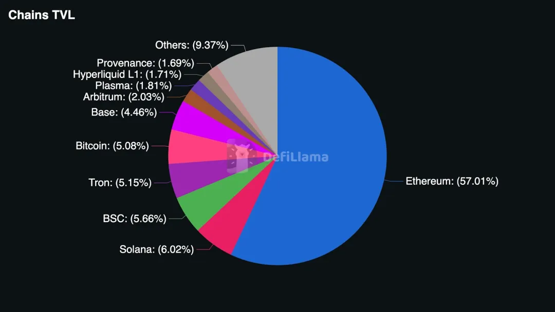 第二,流动性深。 以太坊DeFi总锁仓量(TVL)超过550亿美元,是Solana的10倍,占全网57%的份额。一个AI想借700万美元,在Aave上可以瞬间完成,几乎没有滑点。