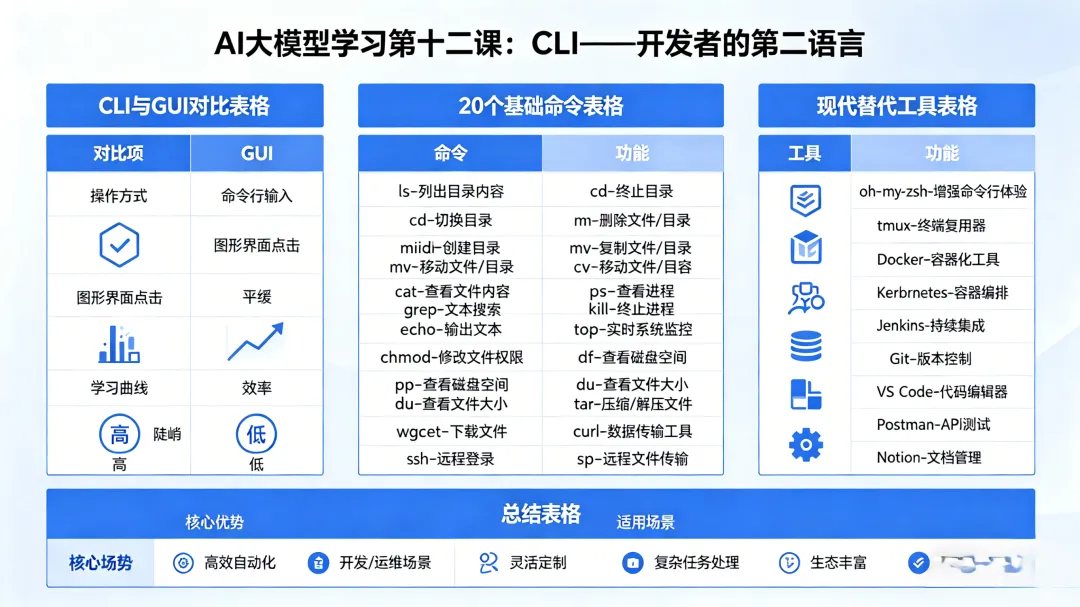 一个形象的比喻:GUI是汽车的“自动挡”,CLI是“手动挡”——CLI需要学习,但操控感更强、效率更高,能完成更复杂的“驾驶动作”。