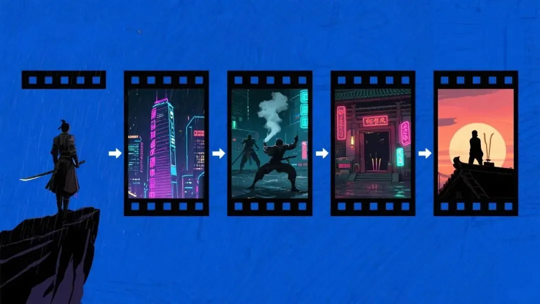 我们的案例短剧叫《霓虹剑客》,讲的是一个机械义体的剑客,在未来都市的霓虹灯下寻找师父遗言的故事。风格上我想往徐克的侠气加银翼杀手的光影那个方向靠——当然最后能做到几成,说实话我心里也没底。一个孤独的剑客在霓虹丛林里狂奔,光是想想这个画面,我就觉得挺带劲的。