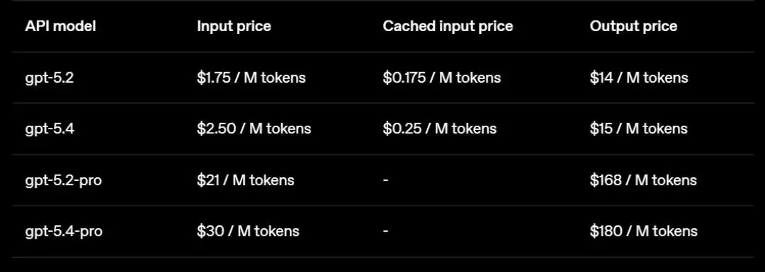 定价方面,GPT-5.4再创新高,输入价格2.5美元/百万token,输出价格15美元/百万token。