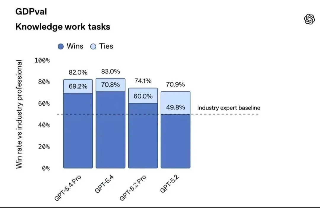 在GDPval基准测试中,GPT-5.4以83.0%的成绩,追平甚至超越了行业内的专业人士。