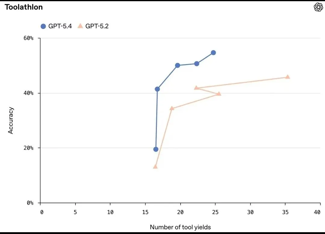 在Toolathlon上,GPT-5.4以54.6%准确率,大幅领先GPT-5.3-Codex(51.9%)、GPT-5.2(45.7%),而且用的轮次更少。