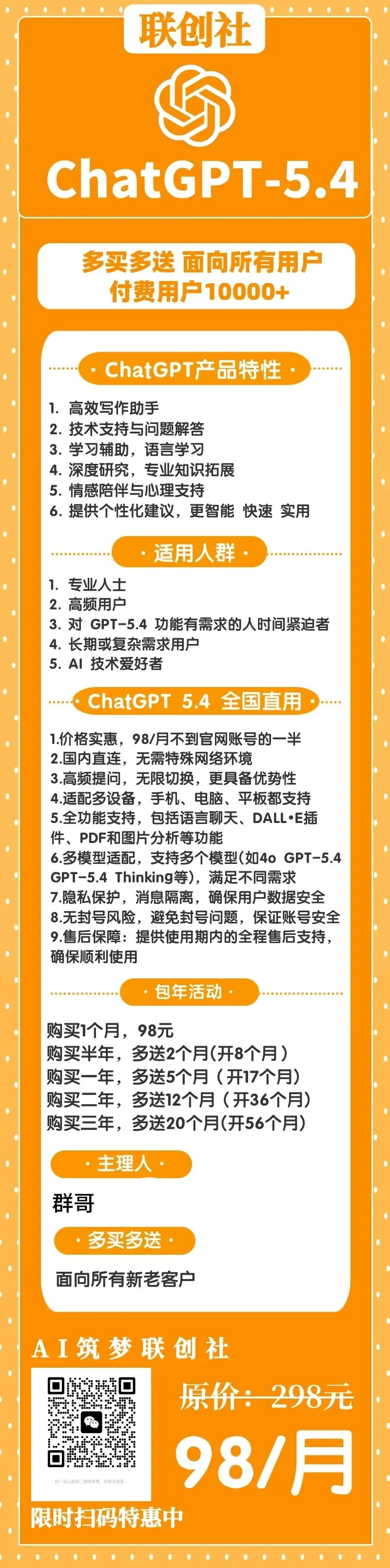 一句话说明:用官方一半价格的钱!用跟官方 ChatGPT 5.4 一模一样功能,无需魔法,无视封号,不必担心次数不够。