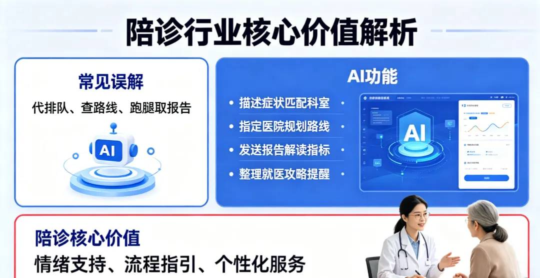 很多人对陪诊的误解,还停留在 “代排队、查路线、跑腿取报告”,觉得这些事 AI 都能做,陪诊就没价值了。
