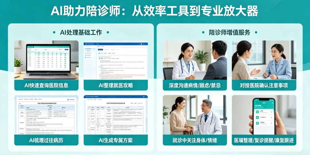 AI 永远替代不了真人陪诊。恰恰相反,AI 的爆火,会帮行业淘汰掉浑水摸鱼的 “跑腿型陪诊”,让真正专业的陪诊师,越来越值钱。