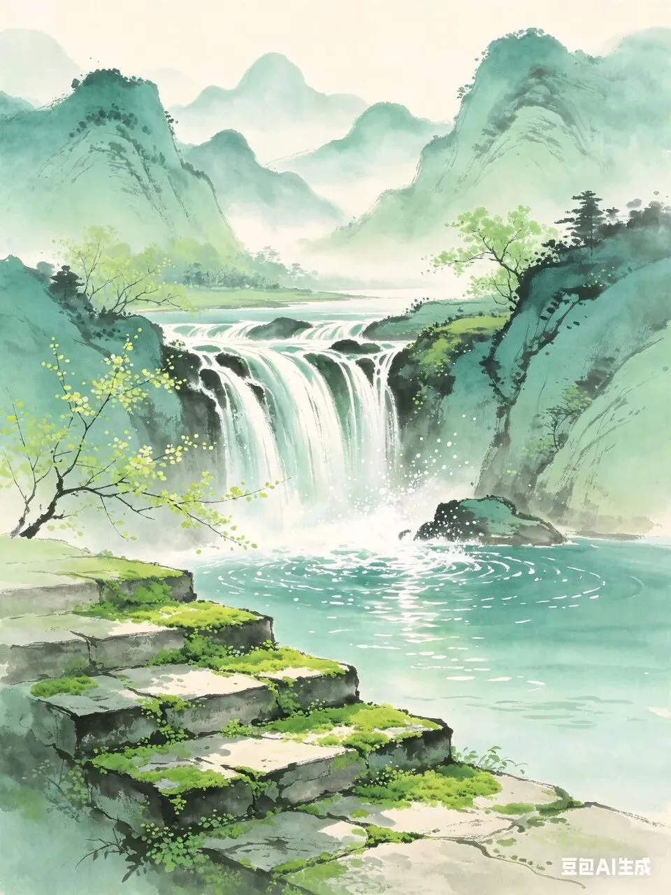 释义:暮春将尽,草木的绿意晕染了山间小径,连石阶上的青苔都浸成了鲜亮的青绿色;新涨的山瀑布落进深涧,叮咚水声格外清脆动人。整副联描绘了暮春山野的清幽景色,抒发了寄身林泉的悠闲自在。