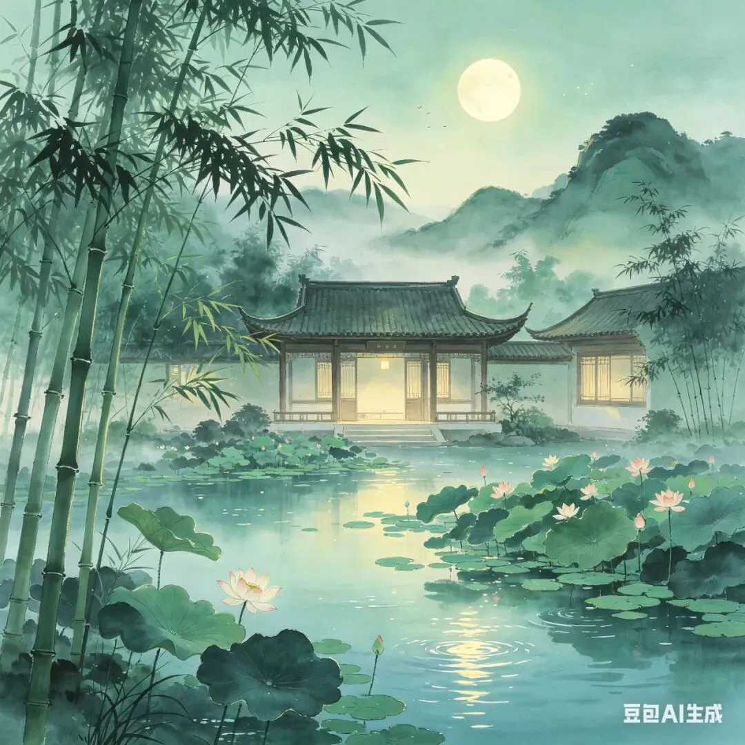 释义:清幽的竹庭院落里,晚风轻柔掠过,吹得手中团扇的影子轻轻晃动摇曳;种满荷花的池塘边,明月静静高悬,月光落在水面,漾开一道道浅浅的波纹。整副联勾勒出夏夜庭院纳凉的悠然场景,传达出褪去暑热后的清净舒心。