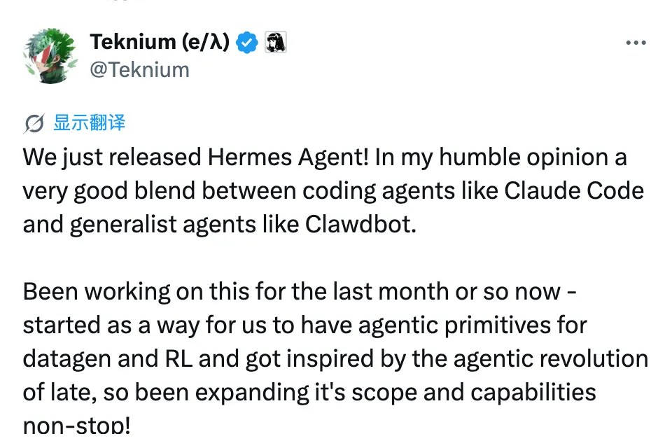 Teknium 在发布日给出的定位:Claude Code 和 Clawdbot 之间的 blend