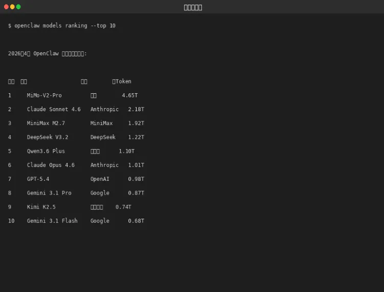 图 1-1:2026年4月模型使用排行榜