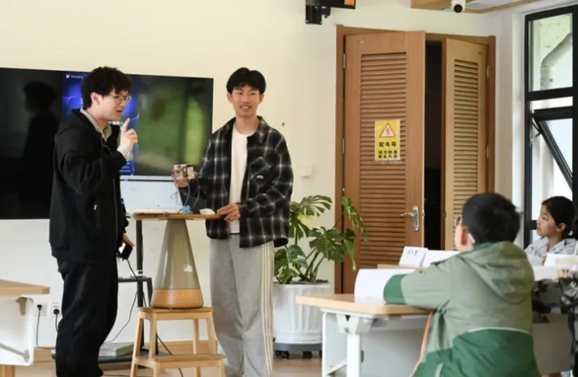 (两位技术老师和孩子们互动,他们来自中国计量大学电子信息工程专业)