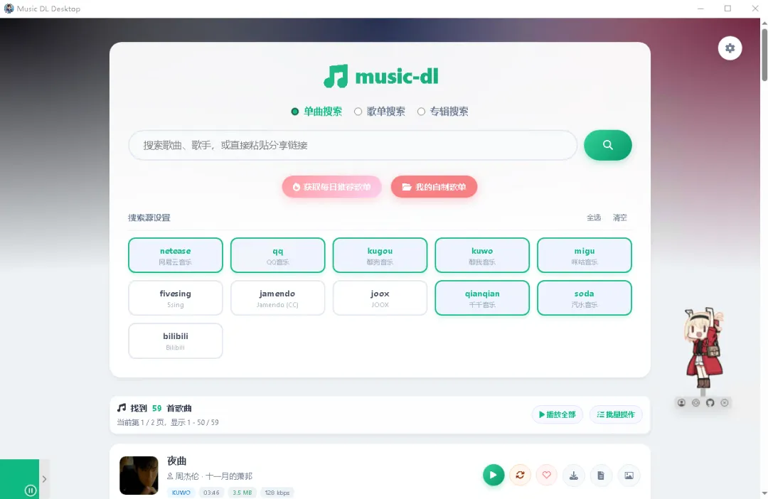 • 每日推荐:聚合网易云、QQ、酷狗、酷我的每日推荐歌单