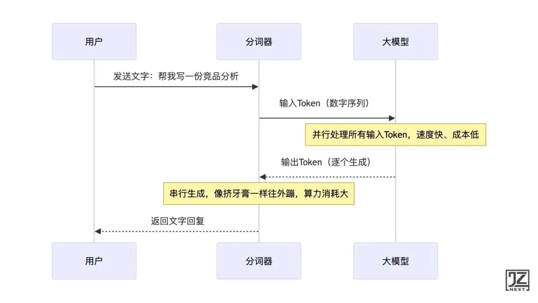 输出 Token:模型必须串行生成,前一个词没生成,后一个词就无法计算。就像工厂流水线,原材料(输入)可以批量卸货,但成品(输出)只能一件一件下线。