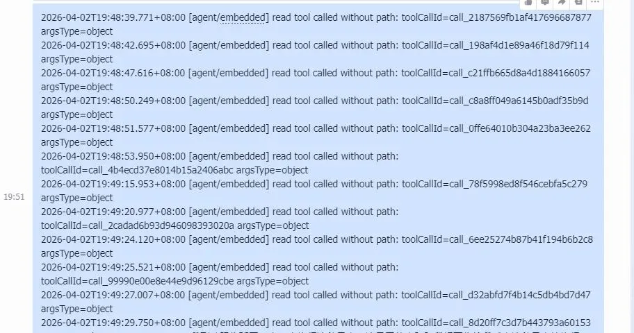 问题本质就是这个上下文确实有点长,导致每次跟它的聊天都会触发压缩!还有就是调用read tool时因为它缺少这个path参数,所以它就一直进行循环,这就导致订阅的套餐内token消耗飞速增长!