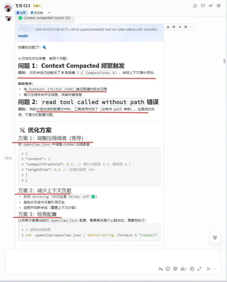 这几天用龙虾进行聊天时遇到那种每个聊天都会出发上下文压缩的现象,然后经过一番折腾呢终于解决了这个问题,这里特地记录如下并分享给大家!