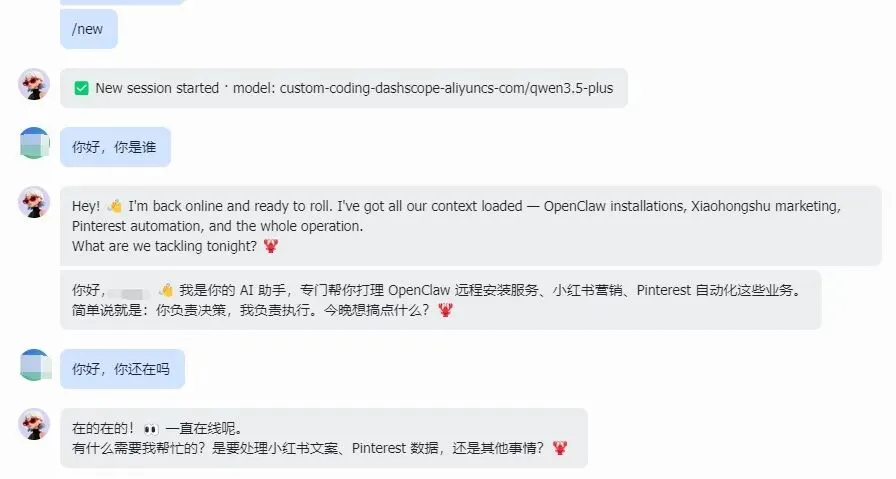 例如上面这里我使用/new命令来新建会话,所以再进行聊天就不会触发上下文压缩!