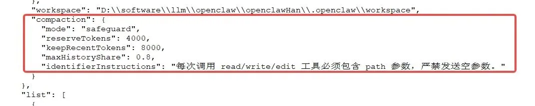 mode:safeguard,这里压缩模式设置为保护模式。当token达到上限时,它不会简单粗暴的删除所有历史会话,而是根据底下的规则优先保留重要的数据,只删除重要程度比较低的那些;