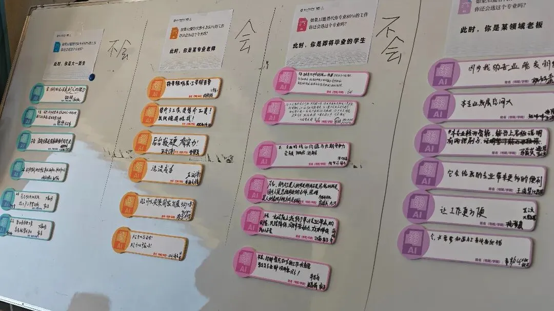 随着五汶书院发展导师刘珊的提问与引导,大家纷纷在彩色卡片上写下自己的答案,一张张贴满了前面的黑板。“大一新生们”率先表达了坚定的态度。“就算AI能替代80%,我就不学这个专业了。”来自东岳书院/智能工程学院的侯代权同学说道。“不是不喜欢,是害怕。我怕四年学出来,发现会的东西已经不值钱了。李开复在书里说,很多重复性岗位会被取代——那我学的这些东西,是不是就是第一批被淘汰的?”他顿了顿,补了一句:“不是放弃,是想先活下来。