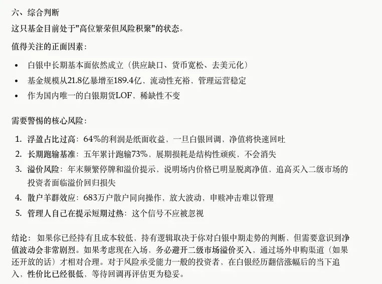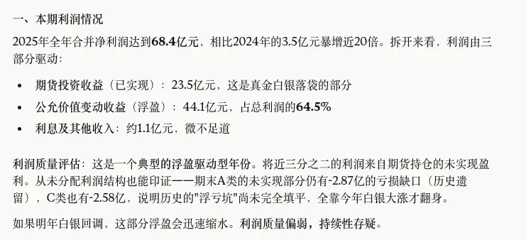一份标准的基金季报动辄几十页,中报和年报甚至上百页,如果看一份还好,但是如果要检索全市场的季报那能看到哪些就纯靠运气了。我把国投白银的2025年年度报告直接丢给了Claude,让它帮我做了一个深度分析。结果很震撼,我觉得它交付我的初始版本至少是一个有三年工作经验的人才能交付的成果。不断对话更新后的版本,更是已经接近资深研究员的成果。你是一位资深基金研究员,我会给你一份基金年报的完整内容。 请严格按照以下六个维度进行深度分析,每个维度单独成段, 用简洁专业但口语化的语言输出,避免废话和套话。