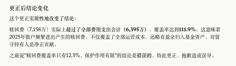 先说利润情况这块它给我的分析,这块它说利润质量偏弱,存续性存疑,这个明显是有些问题的。这里面AI可能不太懂基金的运作,因为根据基金的合同要求,这类期货基金是需要把90%以上部分放在期货里的。这就意味着,如果没有到需要移仓的节点,它是不会主动止盈把浮盈变成利润的。而白银价格的大涨主要集中在2025年的四季度,所有浮盈远高于利润是可以理解的。补充完这些之后,它提出了一个非常重要的核心点,那就是真正体现利润质量的是跟踪误差。如果就这个点分析下去,就商品类基金就大有可分析的地方了,甚至可以写一篇非常深度的研究报告。而在这一波白银大涨大跌的背景下,当时出了很多很多事,核心就是跟踪误差以及估值的问题,这个我们从后视镜来看也能发现。另外,根据这个内容我还让Claude帮我拆解资产负债表深度分析收益、成本和利润。它解读出来了一个有意思的东西——赎回费7.16亿元。我第一反应是有问题,后面让它交叉认证,发现它搞错了一个小数点。但是这个我让它确认了两次它才成功识别出来,也不知道是什么问题。上面的表格里明显的数据是7000多万,但是它给算成了7个亿,直到我直接指出。然后我让它对比了基金的管理费,管理费它又搞错了一个位数,我又纠正了一下,但是结论是有意义的。这里面其实说明了公募新规对于投资者的保护,以及对于金融机构的让利。在2025年新规之前,赎回费其实只有部分是计入基金资产的,一般是不低于25%。但是从这次白银基金的情况来看,在某些极端情况下,赎回费是非常巨大的一块费用,甚至白银基金2025年的赎回费超过了基金的管理费。在计入基金资产的背景下,相当于是你一直持有这只基金,全年就不用交管理费了。当然,这个钱更多还是退出的投资者承担的,但是赎回费计入基金资产确实是非常有意义的,这块监管还是看得非常透。这里面Claude分析的没错,不管是A类还是C类都跑输了业绩比较基准,但是在去年那么大波动的背景下,只有3%我觉得是优秀的。这个也是Claude不具备专业知识里面出现的常识性错误,期货基金因为有移仓的摩擦成本,跟不上业绩比较基准是正常的。这个分析我觉得Claude确实把非常抽象的语言结论给简化了,短期谨慎、中长期乐观但有所保留。我觉得这个观点是大多数投资者想要一眼看到的结论,但是这个结论往往要结合语境和市场综合判断。我好奇如果把2025年中期的展望以及2024年年报的展望一起喂给它,它还能继续分析出什么结论。我把2025年的中期报告和2024年的年度报告也发给你了,你帮我看看管理人市场展望这部分的变化,以及确认下上面部分你的结论是否正确。之前的大模型大家都在卷上下文,所谓的上下文就是大语言模型在一次对话或任务中能同时看到并处理的信息总量。你可以把它想象成模型的短期工作记忆,即窗口内的内容它都能参考,窗口外的就忘了。虽然现在很多模型都有了记忆功能,也就是会记得你之前跟它的一些对话核心要点,但是这个要点是提炼过的。更多细节性的、事实性的、需要回溯的东西,还是需要在一个对话的上下文里体现。我觉得上下文是我在做基金深度研究的时候比较在意的东西,因为如果我需要非常深度的内容,需要不断的给素材然后交叉验证。虽然国内的模型上线文相比起海外的模型明显有差距,但是上下文也不是越大越好。一方面是因为上下文是有打折的,比如一个声称支持200K token的模型,通常在约 130K 时就开始不可靠。另一方面,上下文太大会导致算力的大量消耗,国内的大模型胜在性价比极高,这是我们选择的另外一条路,这个不多说。回到上面,因为PDF喂给大模型,它会用图片的形式保存然后再读取,所以对token的消耗以及对上下文的占用非常夸张。如果我们只需要截取部分片段,那么就可以把相关的内容保存到txt文档里,txt格式是占用量最少的格式。我把2024年年报和2025年中期的报告中管理人的展望复制到了txt的文档里,然后喂给了Claude。变化一:风险提示从有→无→最强