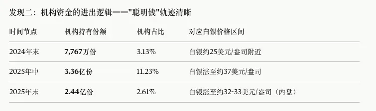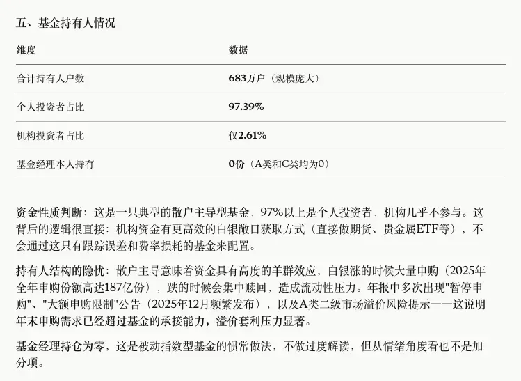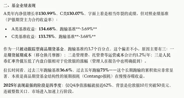 2024年报提示了"波动将加剧",2025年中报反而完全删除了风险提示——这对应的是中报时白银刚突破37美元,市场情绪亢奋,管理人措辞也随之变得更乐观。2025年报则用"显著加剧"做出三期中最强烈的风险警告,对应年末白银突破50美元的极端行情。