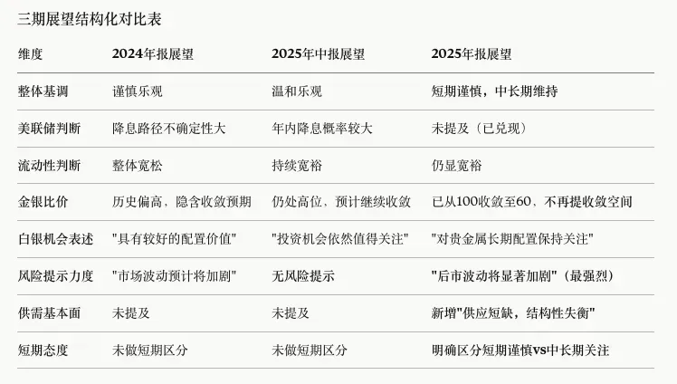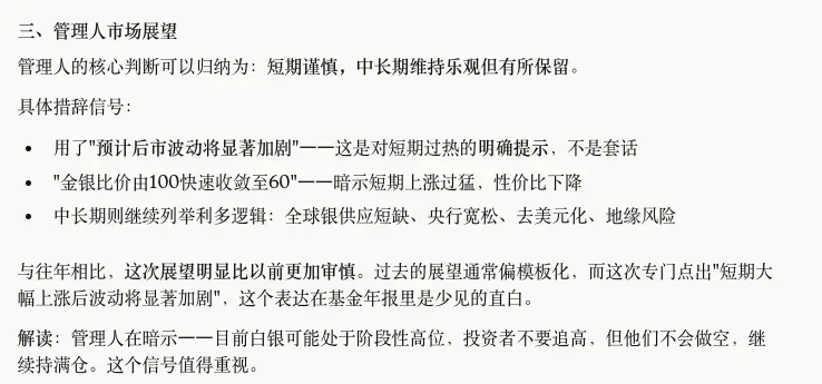 2025年报是三期中唯一明确区分短期和中长期的一次。这个结构本身就是信号:管理人在暗示短期不宜追高,但又不能对持有人说"该跑了",所以用"短期谨慎+中长期关注"来平衡措辞。