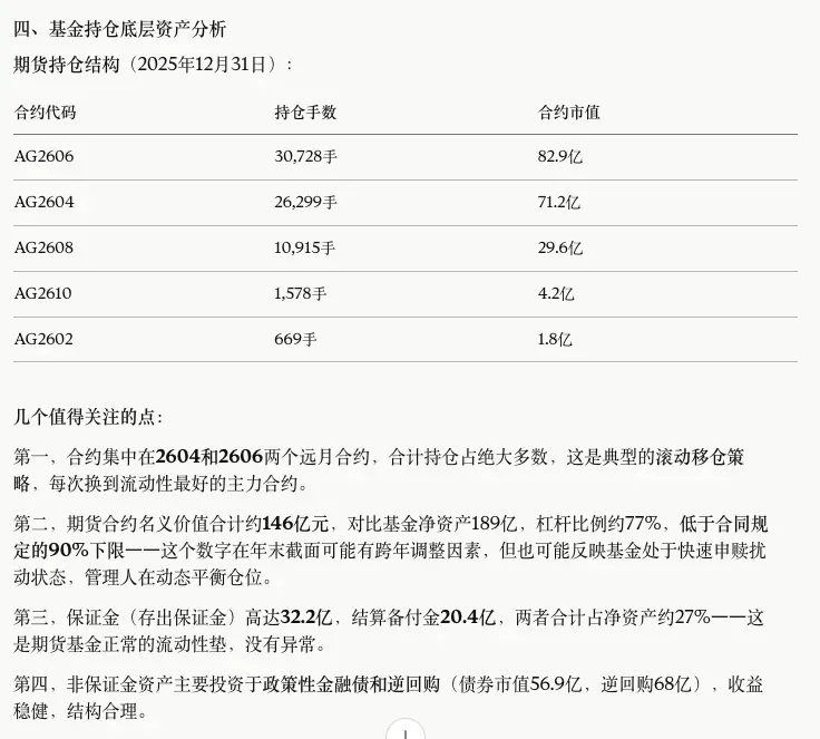 【四、基金持仓底层资产分析】 分析主要持仓资产的结构和集中度。 对于这只白银期货基金,重点分析期货合约的展期策略、 仓位比例、以及持仓结构是否有异常调整。