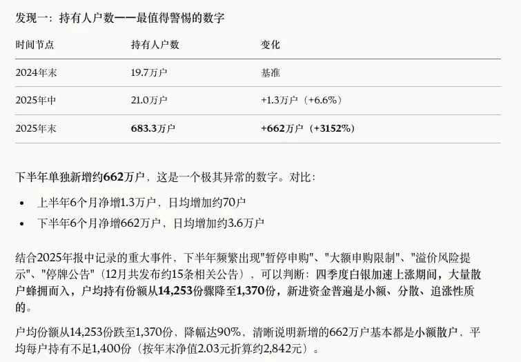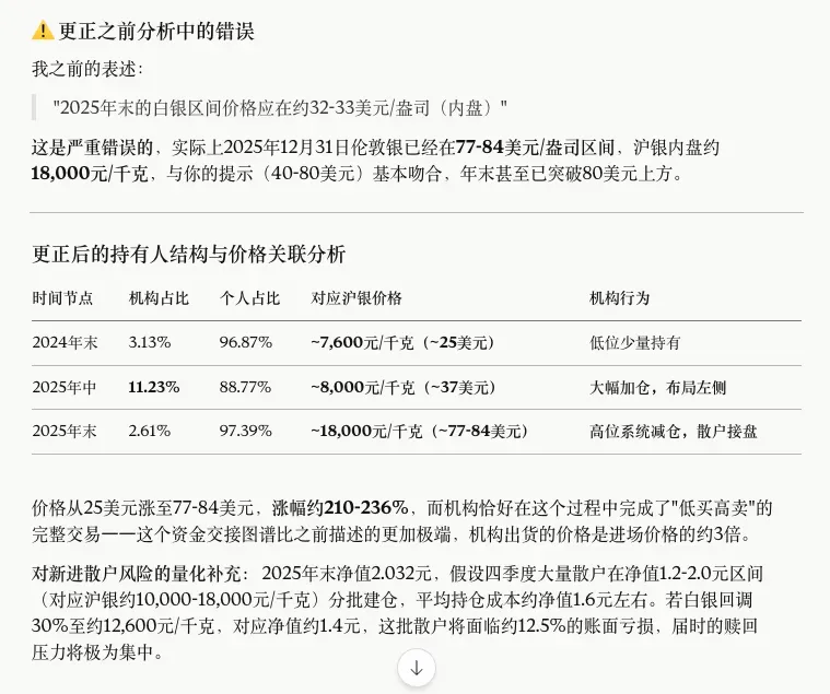 我觉得它对照每次管理人在做展望的时候的分析,做出关键变化解读的内容是这次让我感到最惊艳的。可能本身AI模型这一轮就是从文字对话开始爆发的,所以AI在处理纯文字类工作和对比的时候可靠性是最强的。根据分析底层的持仓,Claude也总结出来这份年报里非常重要的一个点,即杠杆比例只有77%是低于90%下限的。这说明其实从去年底开始,国投瑞银公司就已经开始为应对后期出现的流动性问题开始减少仓位了。如果再结合后面发生的事来看,我觉得这个点是大多数媒体没有关注到的。国投瑞银这一次在白银基金的风险管理上其实做了很多前期工作没有被看到。其实,如果有时候,我还应该把过去一些年份的季报一起喂给Claude,这样对比分析下来会更出色。它直接给出了结论,这是一只典型的散户主导型基金,机构有更高效的方式来配置白银,也算是比较一针见血。我好奇持有人结构在过去几年的变化,就也把前年的年报和去年的中期报告给到了Claude。因为也要转换成txt格式,但是txt没办法粘贴表格,需要转换为txt的结构。这个我就新开了一个对话框,直接把图片给到了Claude,让它帮我直接转成txt再放回之前分析年报的窗口。这里面它分析的也非常不错,但是有一个最大的问题,它把白银对应的区间价格搞错了。2025年年末白银价格从40美元涨到了80美元,它的那个区间显然出现了问题,这会导致它最终的结论出现非常大的偏差。我觉得它的综合判断还是比较有前瞻性的,虽然这些结论我们作为行业内的人很容易就发现,但是对于普通的投资者,则需要一定的功底。